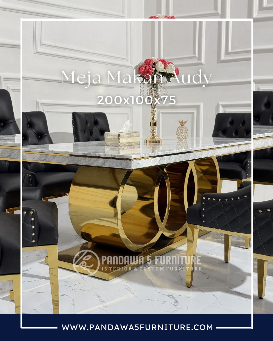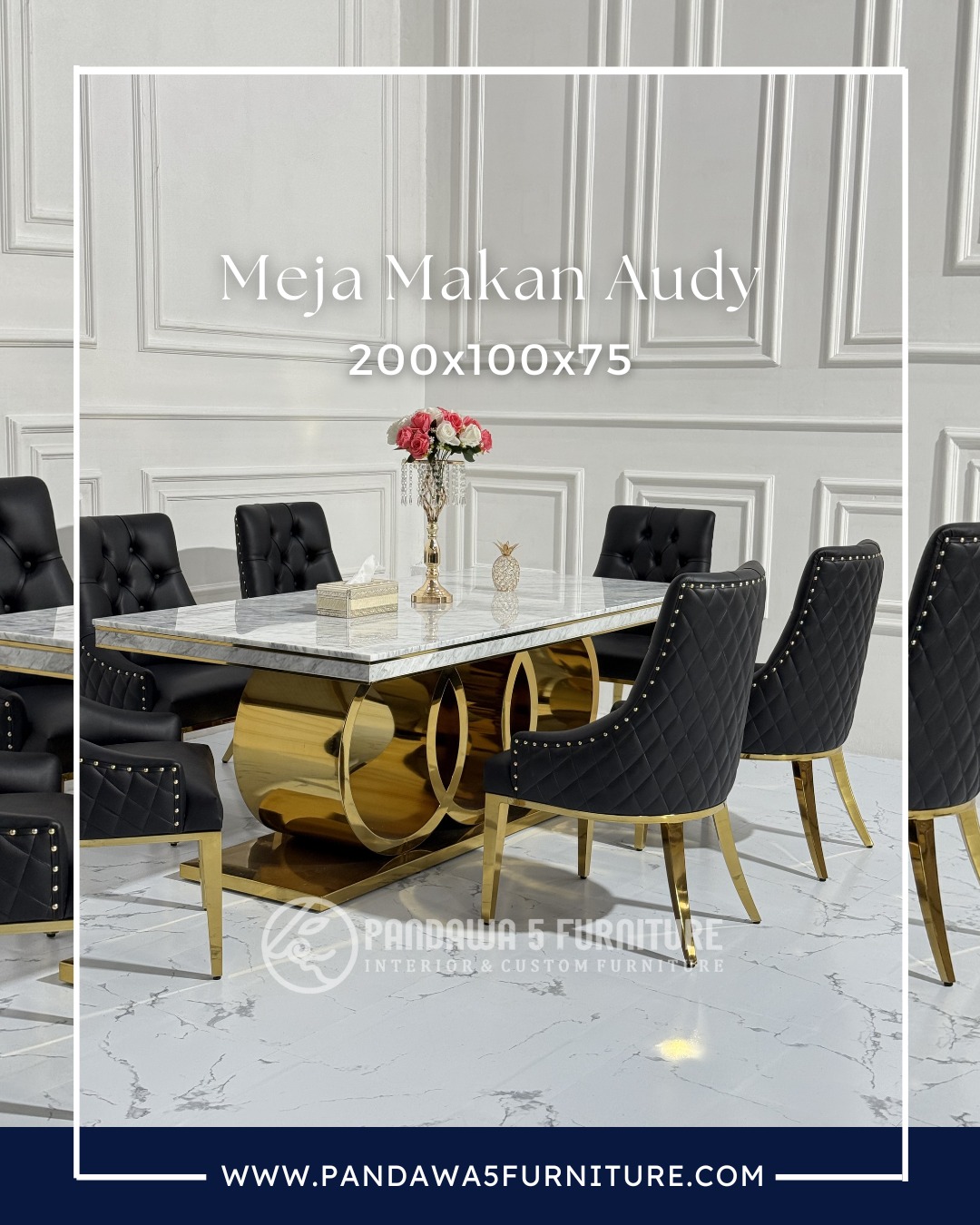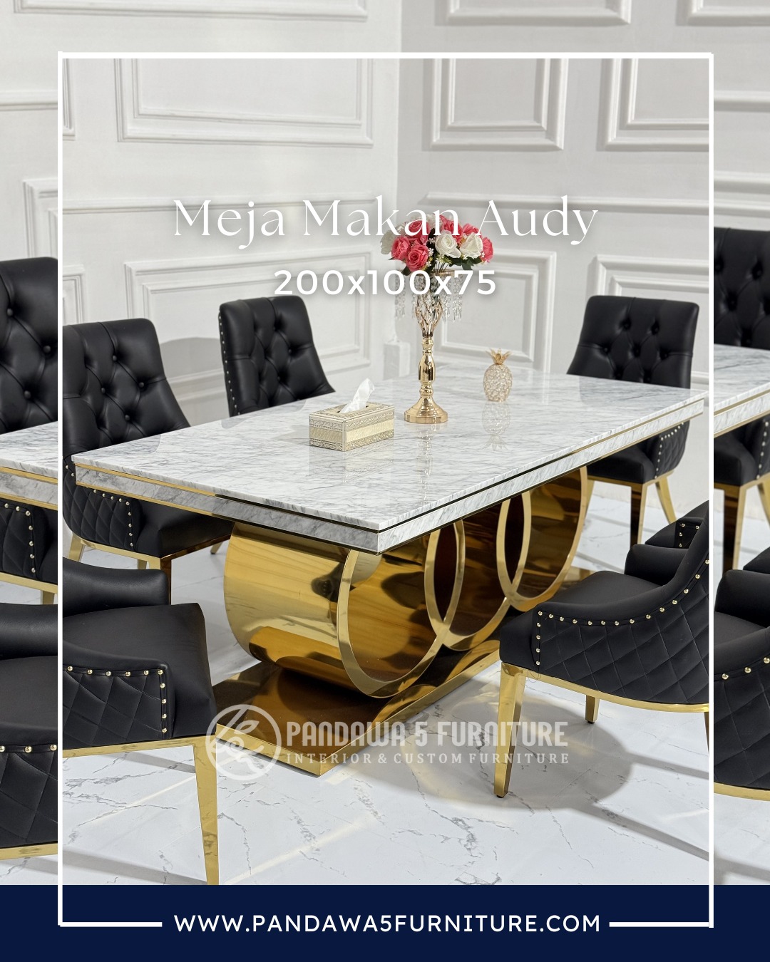 Meja Makan Mewah Audy 200x100x75 – Meja Dining Marble Kaki Stainless Gold