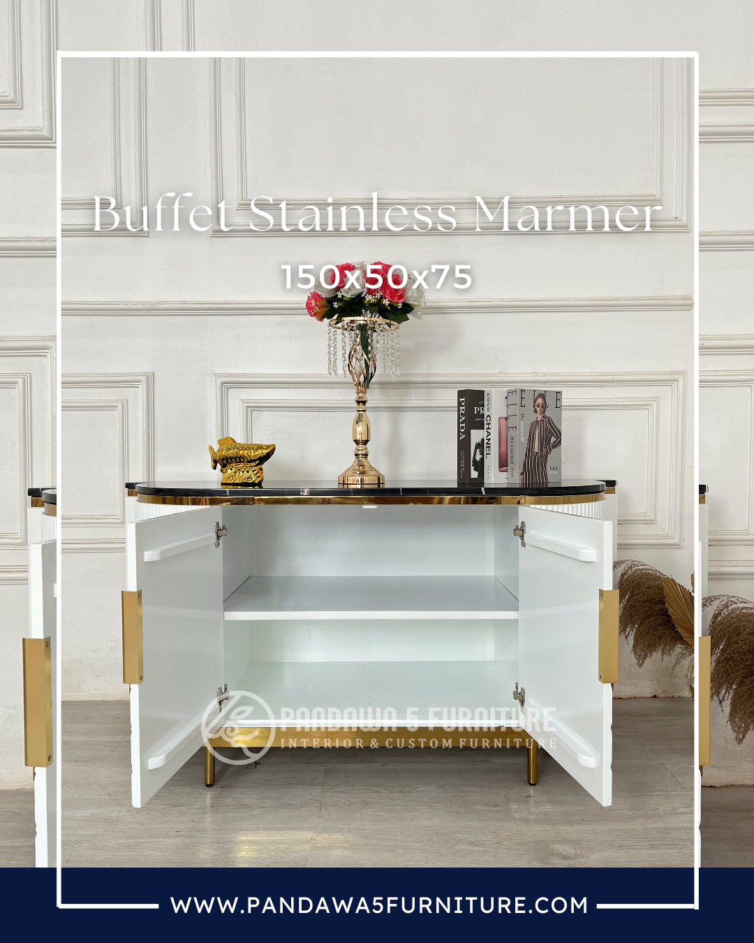 Buffet Stainless Marmer Modern Mewah 150x50x75 – Lemari Hias Minimalis Premium