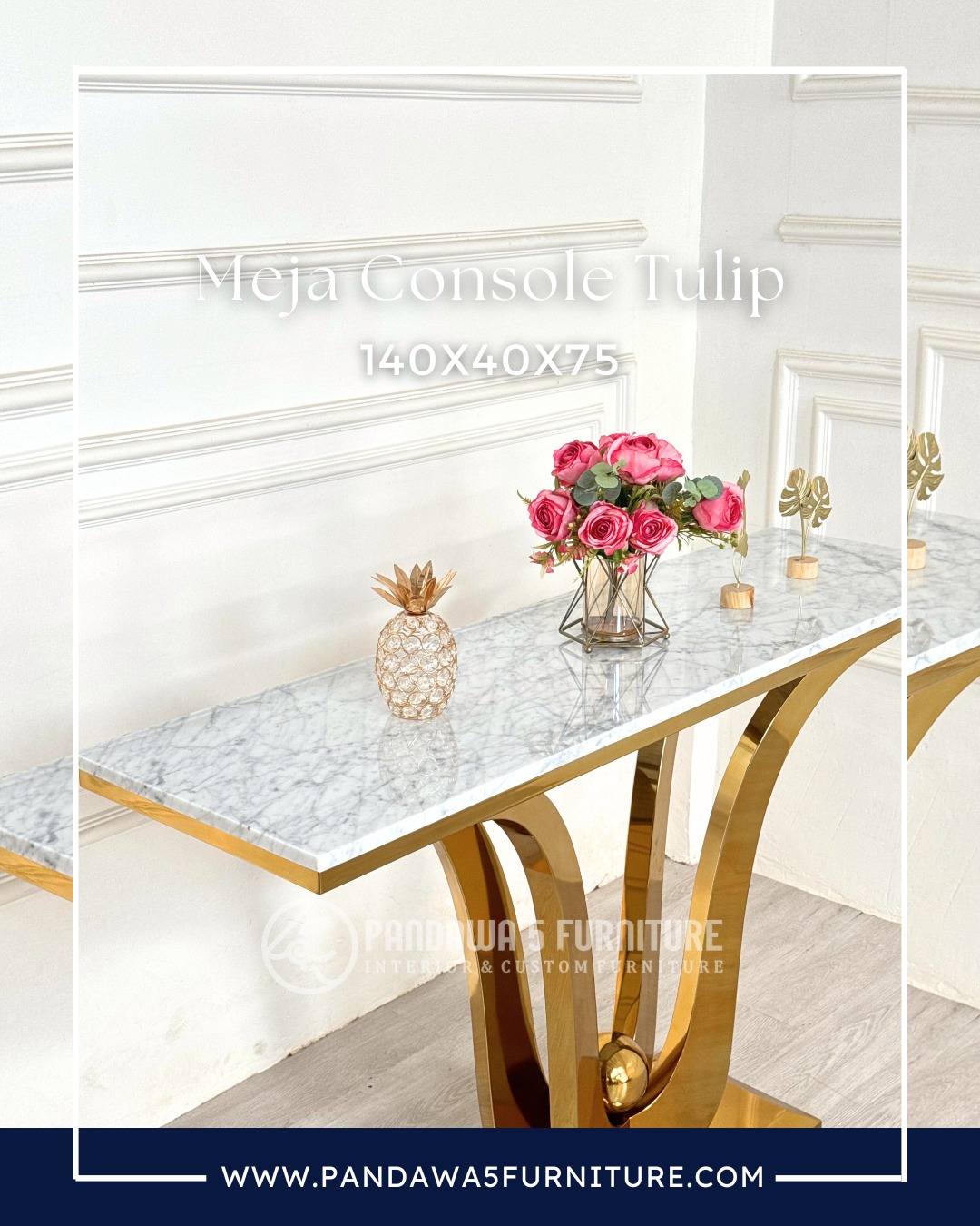 Meja Console Tulip – Stainless Gold dengan Top Marmer Carrara Italy | 140 x 40 x 75 cm