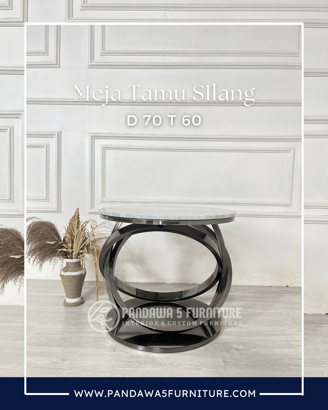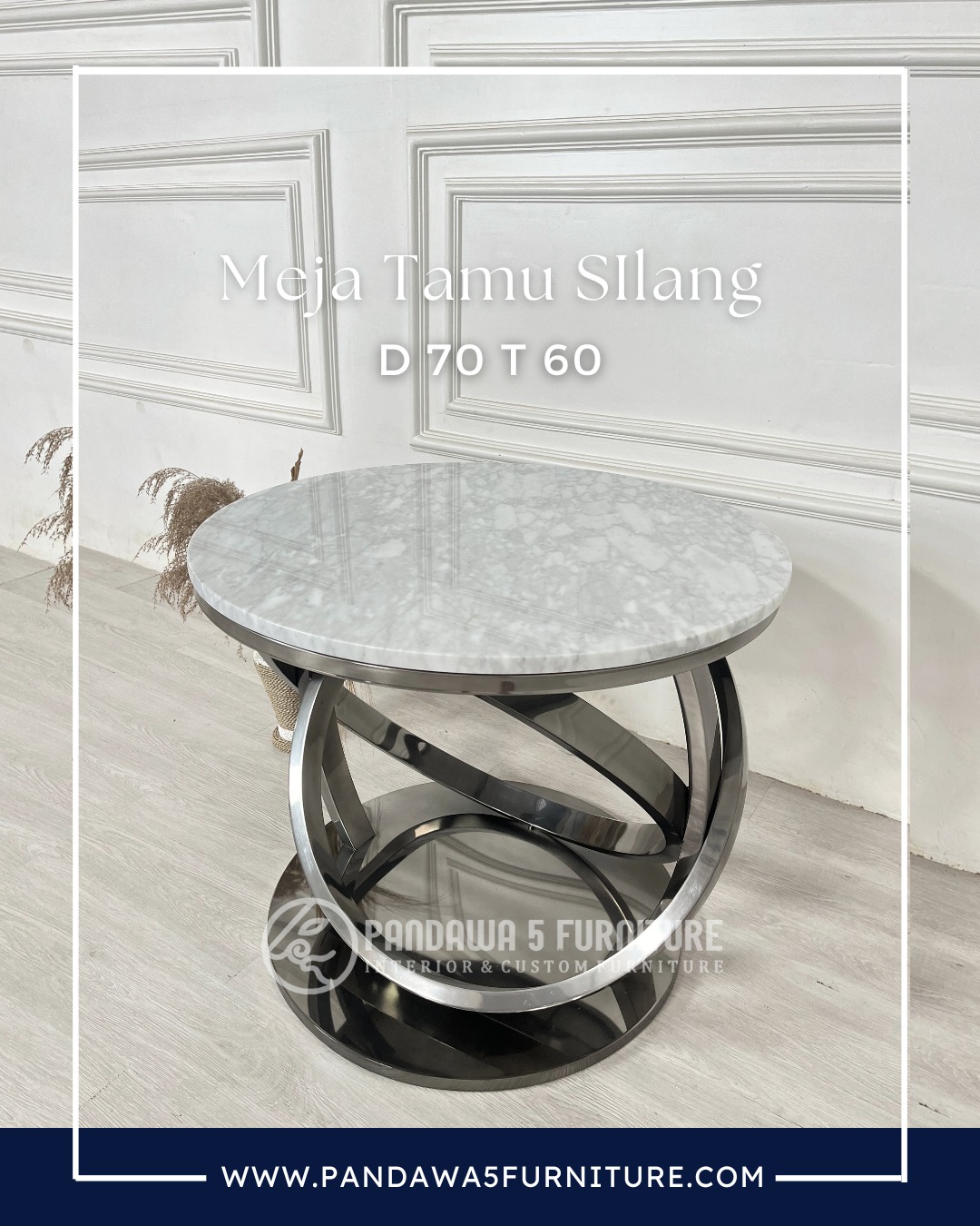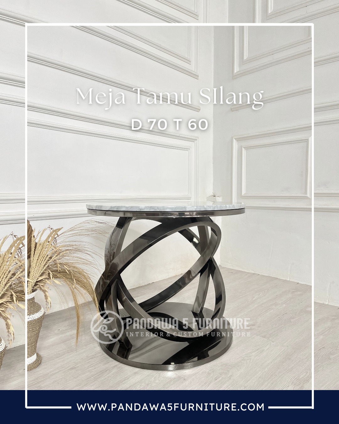 Upgrade tampilan ruang tamu Anda dengan Meja Tamu Silang yang memiliki desain unik dan elegan. Dengan rangka stainless finishing hitam glossy dan permukaan marmer yang kokoh, meja ini menghadirkan nuansa modern-luxury ke dalam ruangan.