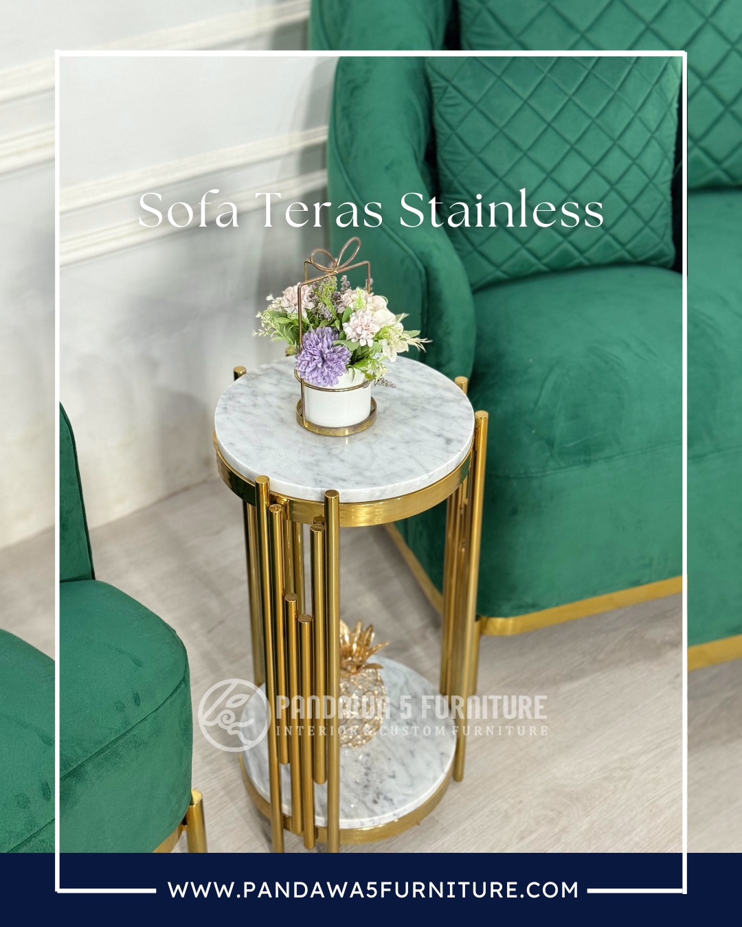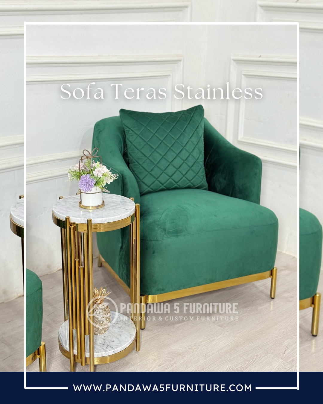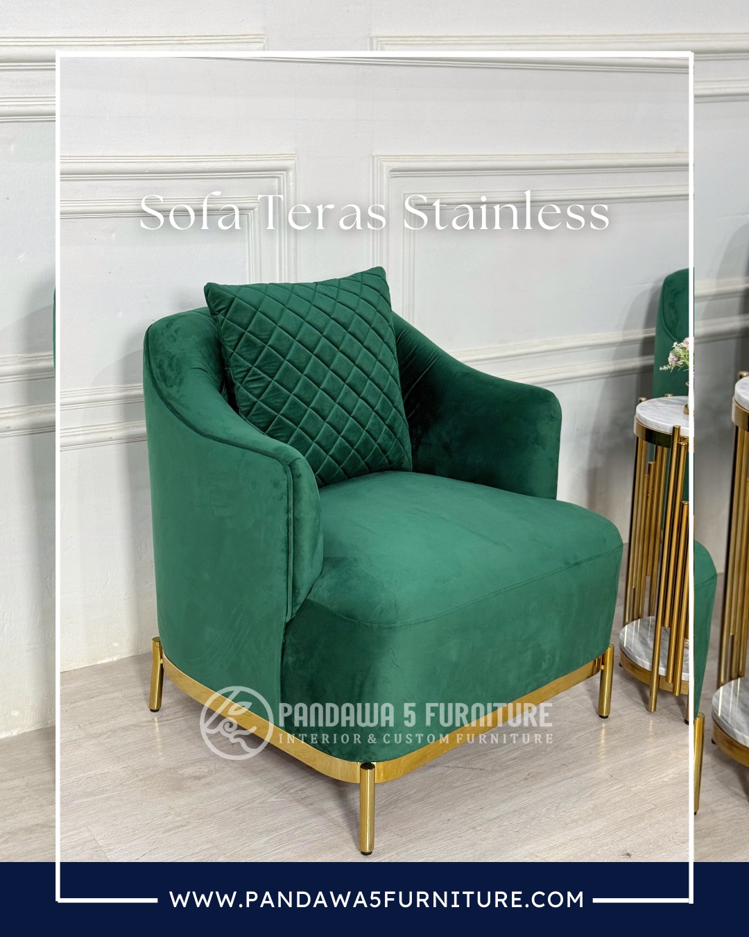 Hadirkan suasana teras yang lebih mewah dan nyaman dengan Sofa Teras Stainless dari Pandawa 5 Furniture. Sofa ini didesain dengan gaya modern yang elegan, menggabungkan rangka stainless steel berlapis gold dengan upholstery kain velvet premium berwarna hijau emerald yang terlihat mewah dan menawan.